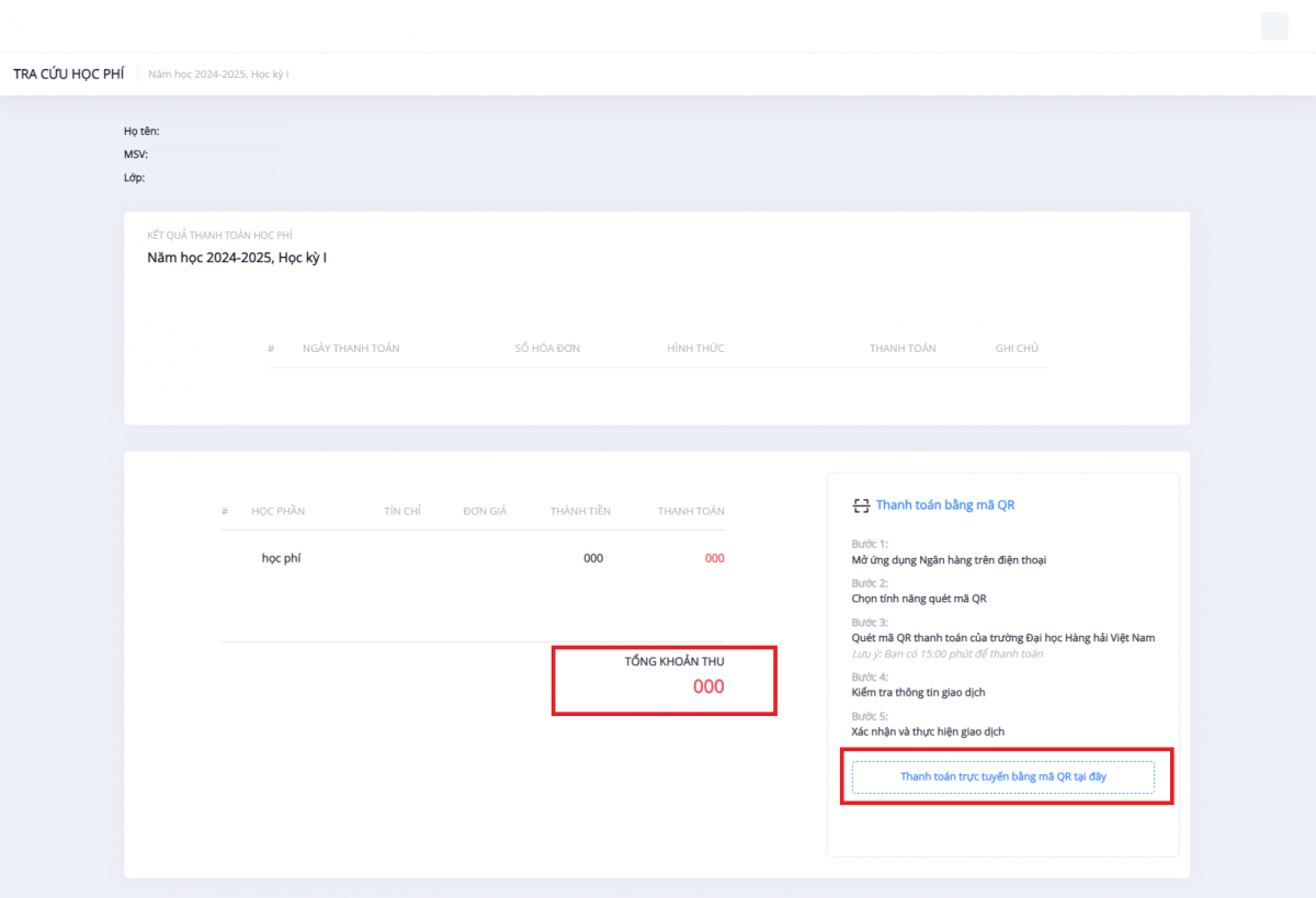 Bước 3: Sinh viên kiểm tra số tiền cần đóng → Ấn nút Thanh toán trực tuyến bằng mã QR tại đây